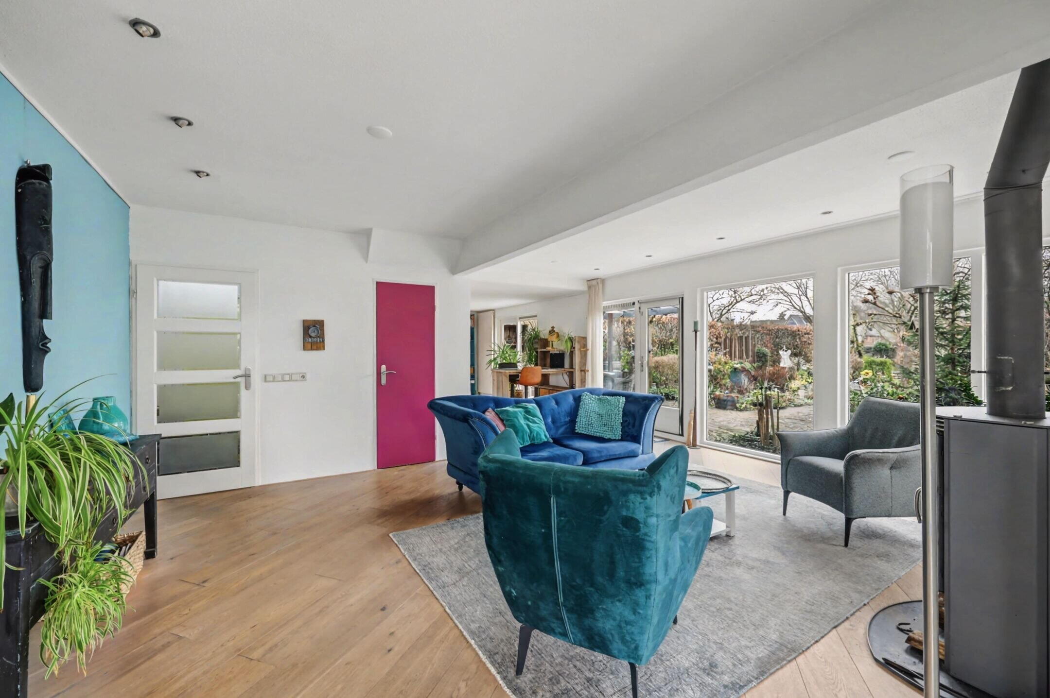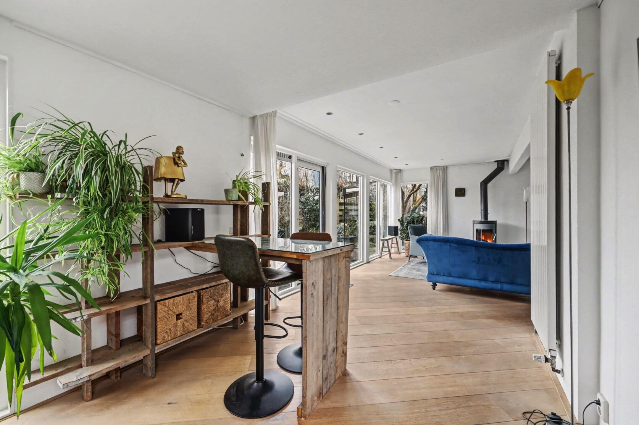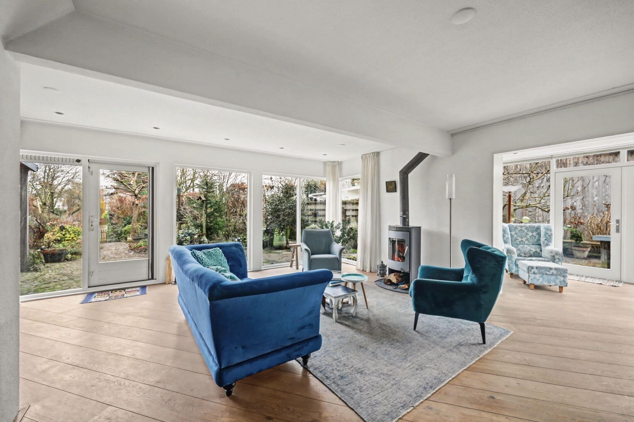 - Royale woonkamer met houtkachel en veel lichtinval door de vele raampartijen