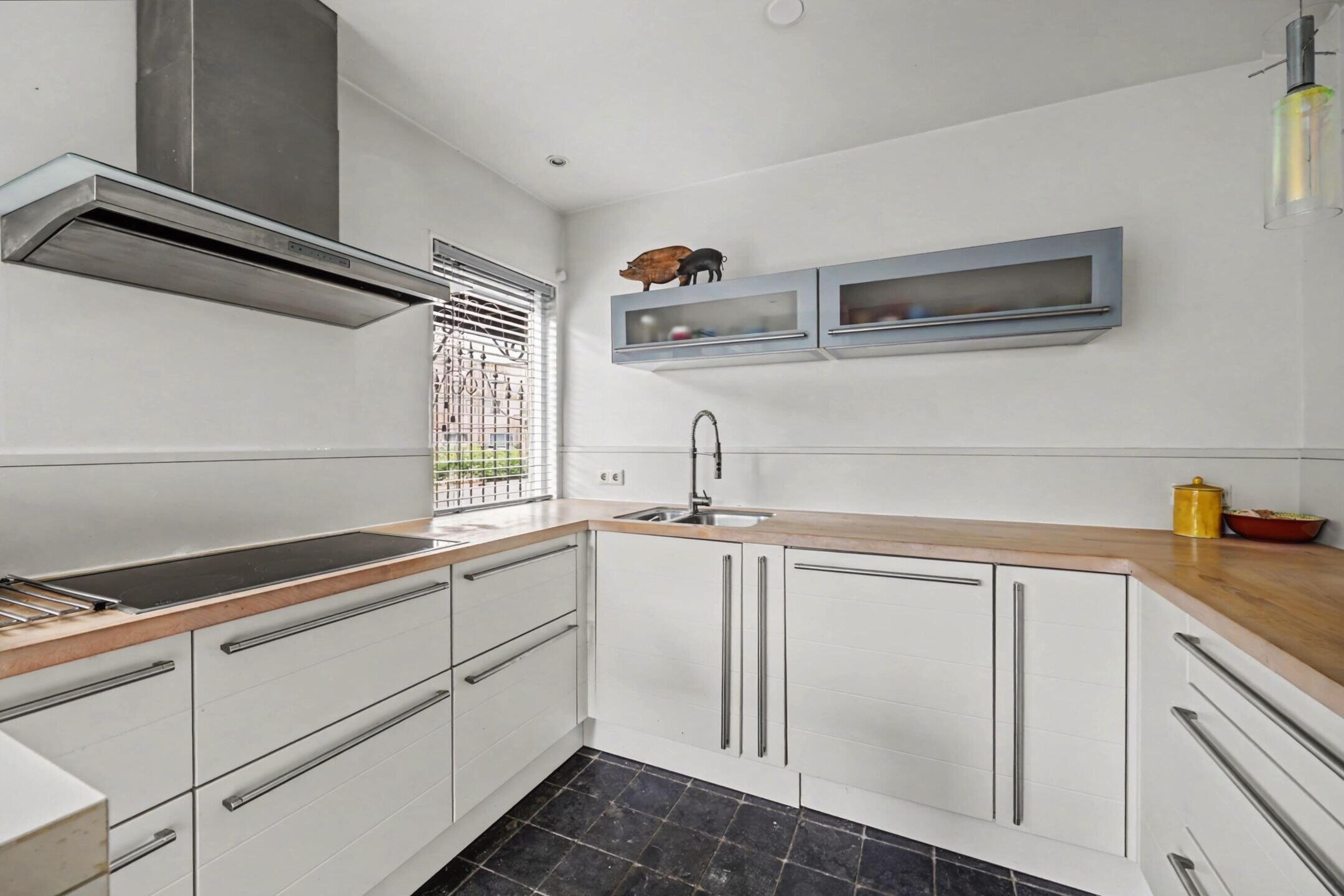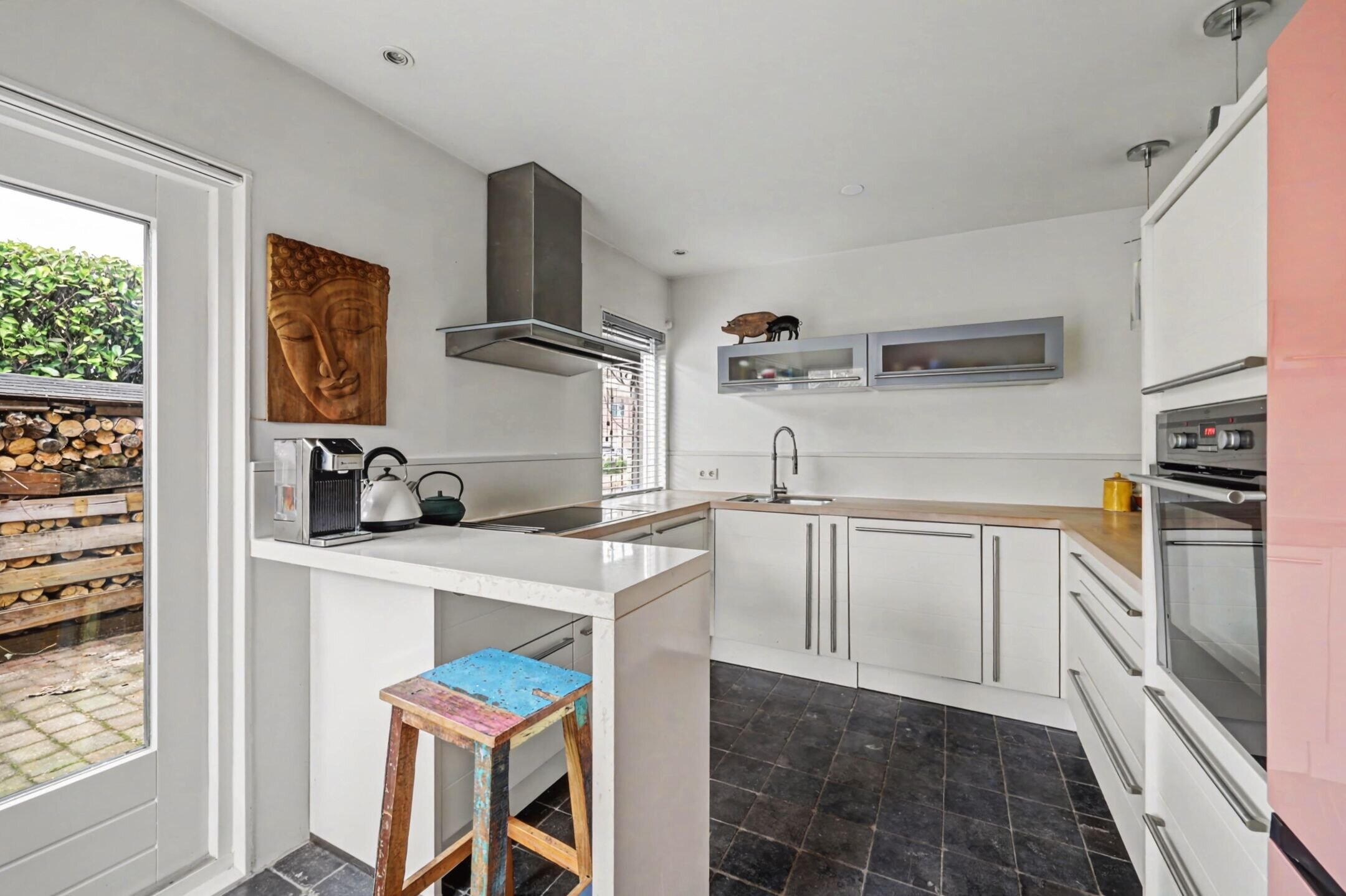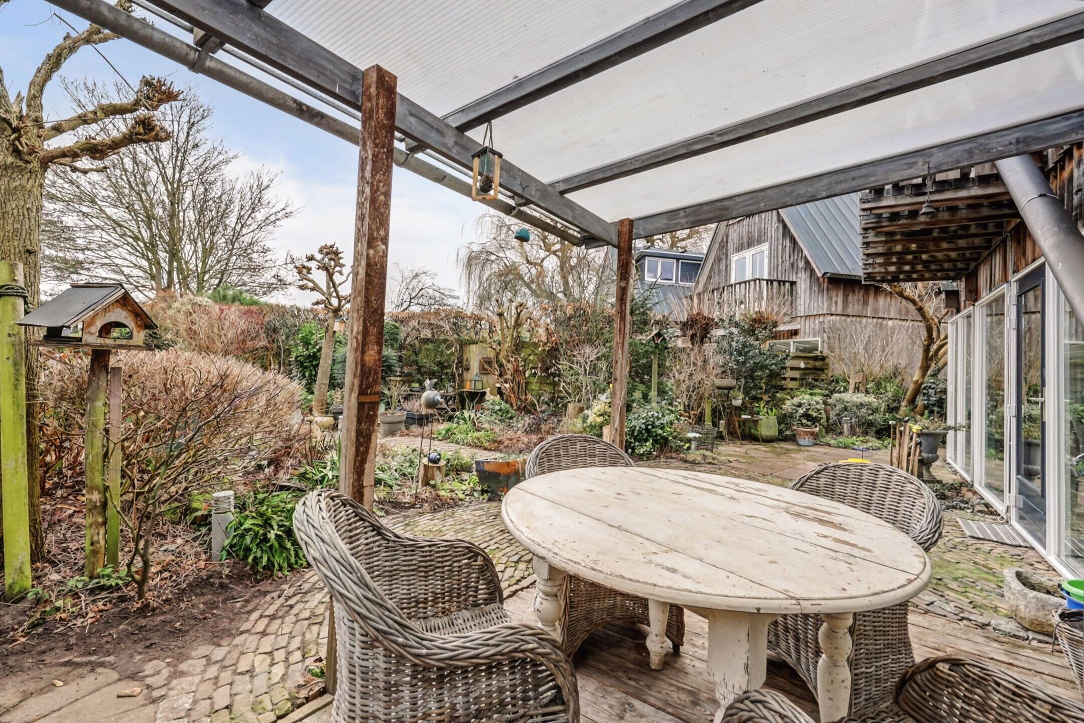 Aan twee zijden van de woning bevinden zich meerdere ruime terrassen, waaronder één met overkapping met houtkachel, waardoor binnen en buiten op natuurlijke wijze in elkaar overlopen. De luxe, dichte keuken is praktisch ingericht en voorzien van een vaste kastenwand met veel opbergruimte, een grote koel-vriescombinatie, inbouwapparatuur, waaronder een inductiekookplaat, vaatwasser en combi oven-magnetron. Vanuit de keuken geeft een deur ook toegang tot de tuin.