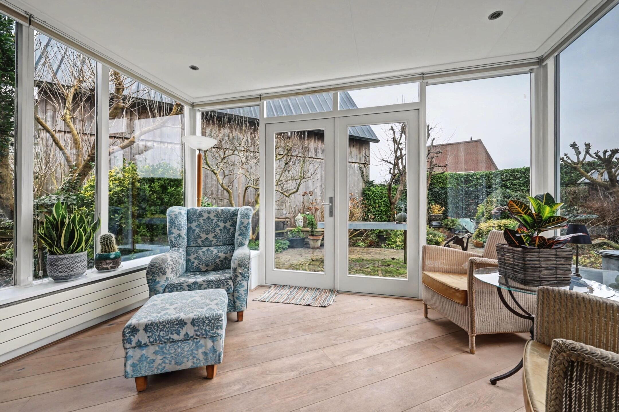 Vanuit de serre kan je de zijtuin bereiken via openslaande deuren. De inpandige berging was voorheen een riante garage en is in het verleden, in twee delen gesplitst. Het voorste deel is nu ingericht als berging. Het tweede, zeer royale deel is bij de woonruimte betrokken en is nu ingericht als eetruimte, met daglicht via een lichttube en een directe toegangsdeur naar buiten. De eetkamer zou ook in de tussenliggende ruimte kunnen worden gecreëerd en de huidige ruimte als televisie-, speel- of kantoorruimte worden ingericht.