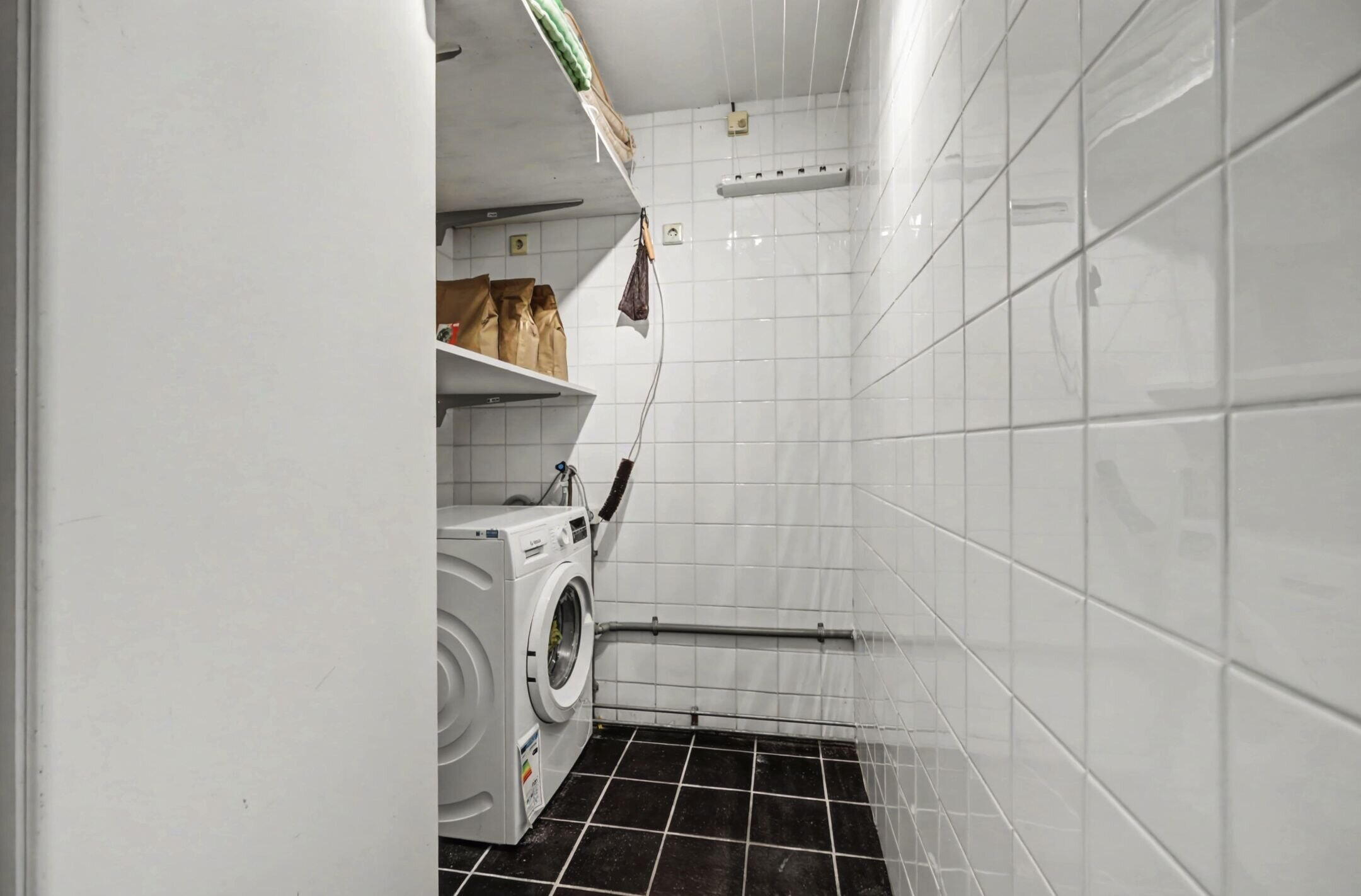 You enter the property via a spacious hallway with meter cupboard, separate wardrobe area with access to the internal storage room, a modern toilet with wall-hung WC and washbasin, a separate laundry room and the staircase.
