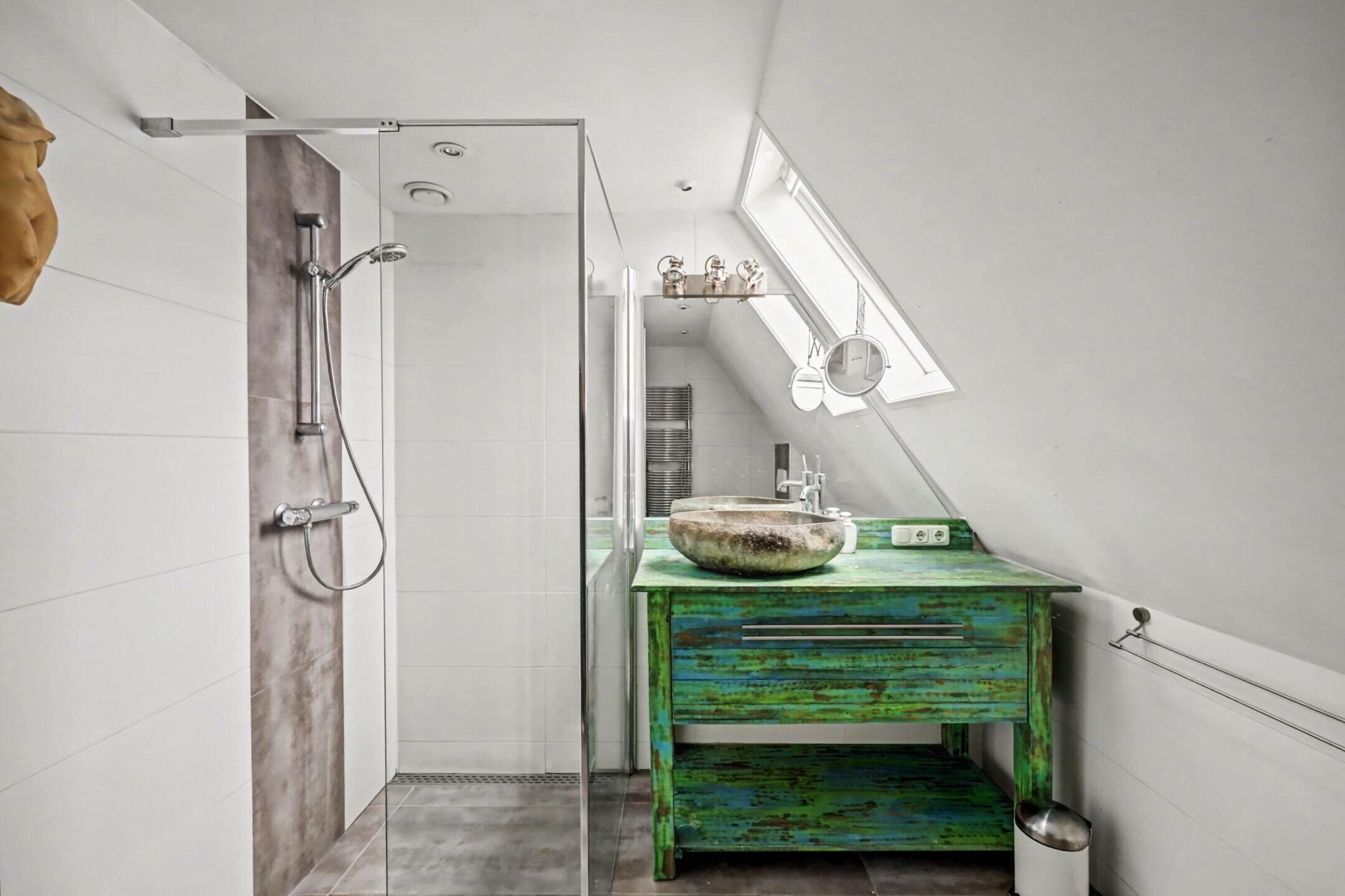 The two bedrooms at the front, one with a built-in wardrobe, are slightly smaller but still spacious and ideal as children’s rooms, guest rooms or home offices. The bathroom is fully equipped with a second toilet, vanity unit with mirror and a walk-in shower. A roof window provides natural daylight and ventilation.