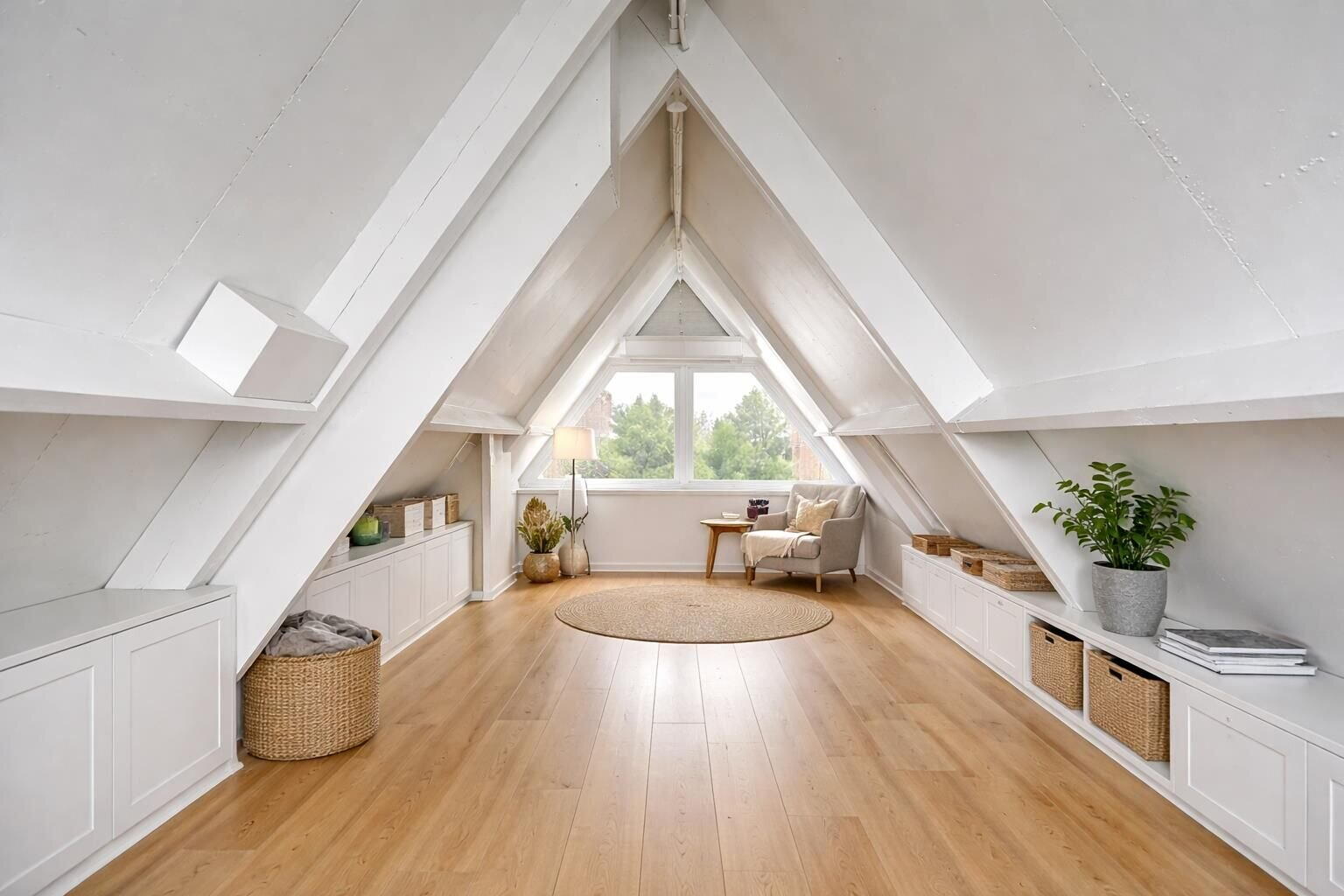 The open-plan second floor is accessed via a fixed staircase and offers excellent possibilities for a fourth bedroom, workspace or hobby room. Installing a dormer window is possible. This floor also houses the central heating system (owned) and an air-conditioning unit.